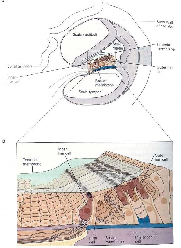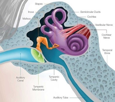 The damage of these sensory cells can be seen due to loud noise, some drugs, inner ear infection or aging. Their permanent loss is characterized by sensorineural hearing loss. The middle and inner ear are completely inside the very hard part of the temporal bone, which is called the spine. In fact, the bony labyrinth is a part of the tympanic bone that covers the inner ear.