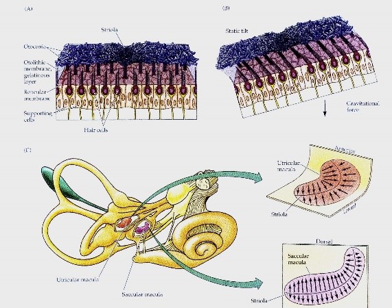 Also, 2 otolith organs in saccule and utricle which respond to linear movements in vertical and horizontal directions. The vertical canals and saccule are located in the vertical axis and the horizontal canal and utricle are located in the horizontal axis of the head. These organs establish neural connections in the brain with the oculomotor system (movement of the eyes) and position control. In addition to sensory receptors, there is also fluid in the vestibular system, which moves the fluid to transfer pressure and cause stimulation in the sensory receptors. As a result, mechanical energy is converted into electrical energy which stimulates the nerve fibers and finally receives electrical information in the brain and processes and integrates them with information from other senses to establish balance.