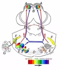 Information from the auditory nerve is then sent to the brain via several nuclei in the brainstem (cochlear nuclei, superior olivary nucleus, lateral lemniscus, inferior colliculus) and midbrain (medial geniculate body). These cores allow further processing of the audio message.