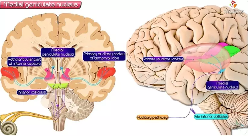 located in the midbrain and in the thalamus and is the last relay center for auditory information before reaching the auditory cortex. The thalamus collects sensory inputs from various modalities and transmits them to the cerebral cortex. The medial knee body includes a segment that has a tonotopic organization. The main function of the internal geniculate body is to transmit auditory information to the cerebral cortex in addition to integrating sensory information.