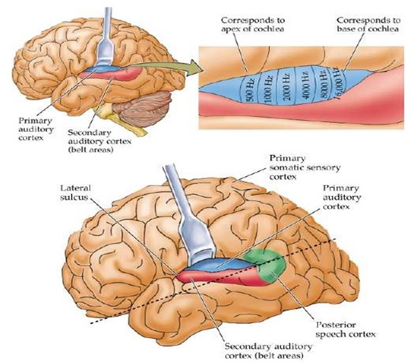 The primary auditory cortex has a tonotopic organization such that the lateral edge of the Sylvian fissure is sensitive to lower frequencies and the inner part of the cortex is sensitive to high frequencies. The primary auditory cortex is responsible for perceiving pitch, rhythm, and duration of sound, while the secondary auditory cortex is responsible for pattern perception, which includes perceiving speech and melody.