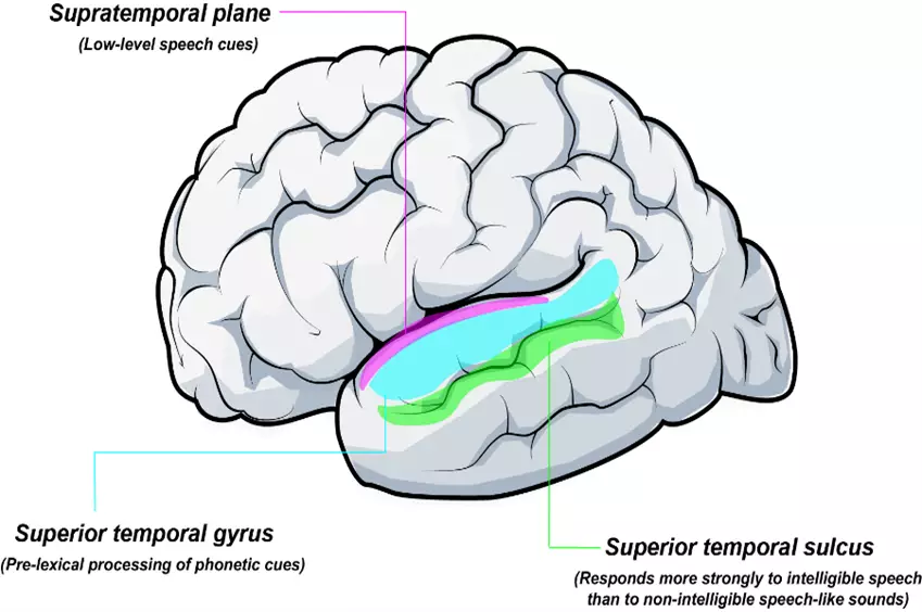 The auditory cortex includes the primary and secondary auditory cortex. The primary auditory cortex is also known as A1 and is located in the temporal plane, marked by the Sylvian fissure on the upper surface of the temporal lobe. The secondary auditory cortex (A2) surrounds the primary auditory cortex.