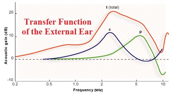 The outer ear is a band-pass filter that emphasizes high frequencies. By creating an obstacle in the external ear opening, it becomes a low-pass filter. The ear canal, like closed vocal tubes, amplifies sounds by 10 to 15 decibels in the frequency range of 3 to 4 kHz. In addition, the external ear canal along with the earlobe play a role in the direction of sounds.
