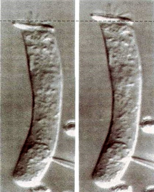 The movement of the basilar membrane causes the cilia of the external hair cells to bend, which in turn will stimulate the external hair cells in the same area, and the stimulation of the external hair cells will result in the shortening of the size of these cells.
