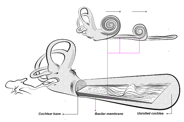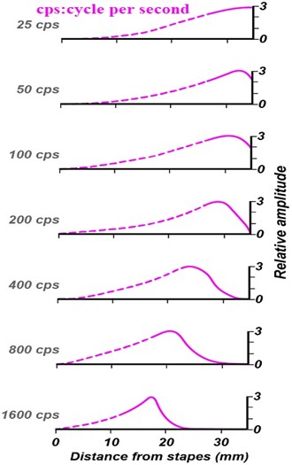 By entering mechanical energy into the cochlea and transferring energy in the cochlea in the form of a traveling wave and receiving this mass of energy in a certain area of ​​the cochlea based on the matching of the frequency of the carrier wave with the characteristics of the basilar membrane (the length of the transverse fibers and their hardness), it causes the maximum displacement in the basilar membrane. The division of the basement membrane in the cochlea is called tonotopic organization, which was first comprehensively proposed by Von Bekesy.